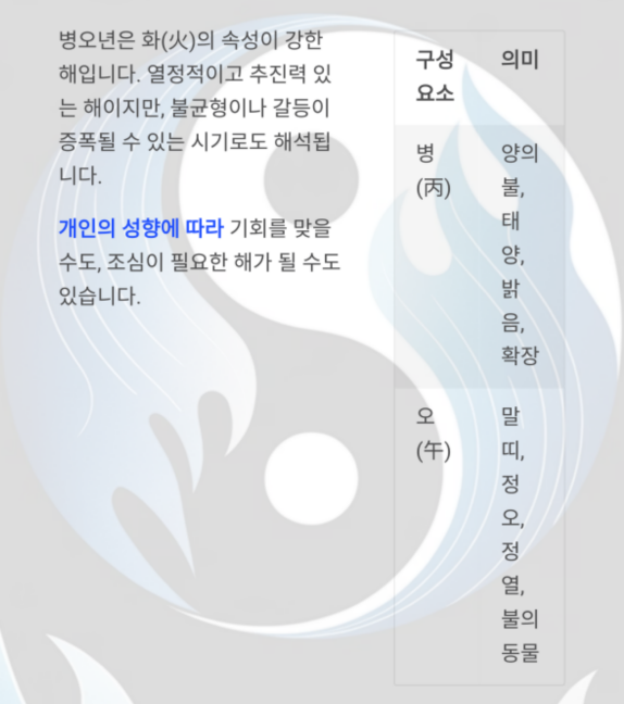 음양오행상 병(丙)은 불(火)의 기운을 뜻하고, 오(午)는 말띠를 상징하죠.