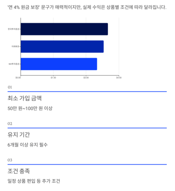 | 한국투자증권 IMA 1호 | 연 4% | 100만 원 이상 | 6개월 이상 유지 |