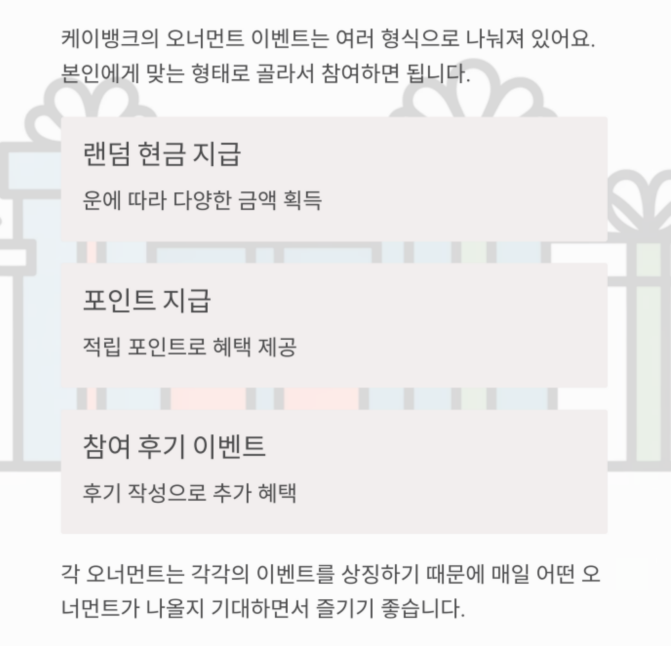 케이뱅크의 이번 오너먼트 이벤트는 여러 가지 형식으로 나눠져 있어요.