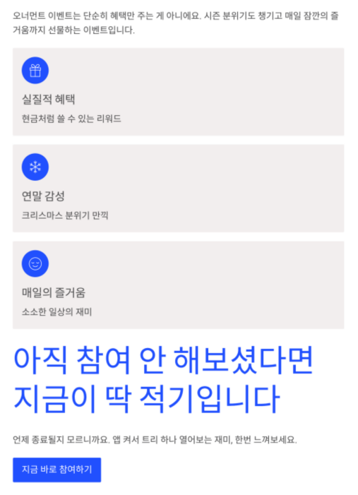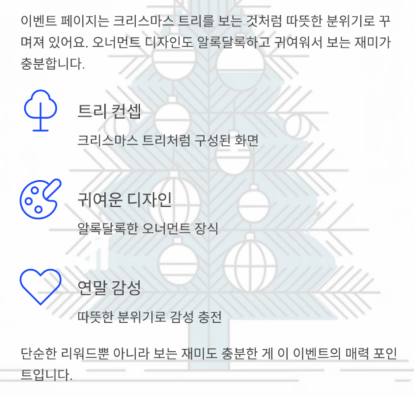 시즌 분위기도 챙기고, 매일 잠깐의 즐거움까지 선물하는 이벤트죠.