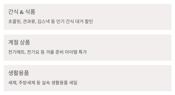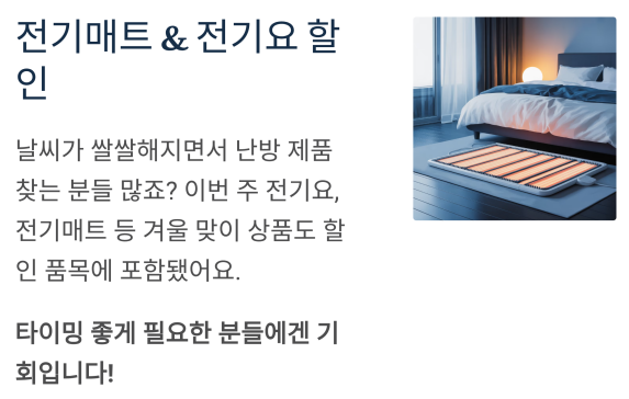 이번 주엔 전기요, 전기매트 등 겨울맞이 상품도 할인 품목에 포함됐어요.
