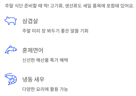 삼겹살, 훈제연어, 냉동 새우 등 다양한 품목이 할인 중입니다.