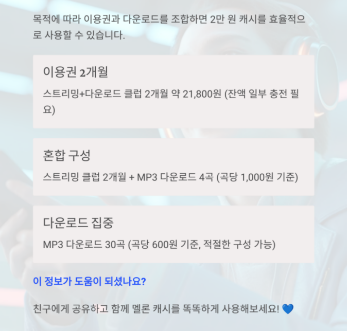 멜론 캐시 2만 원은 꽤 넉넉한 금액입니다.