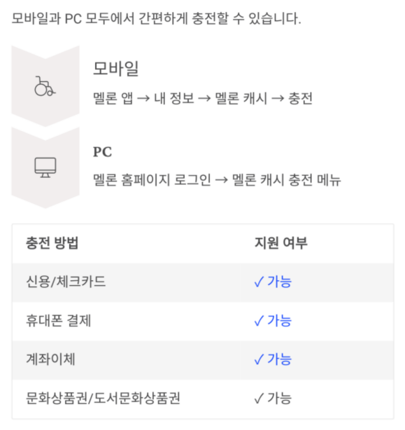 모바일에서는 멜론 앱 접속 → 내 정보 → 멜론 캐시 → 충전 메뉴로 들어가면 되고,
