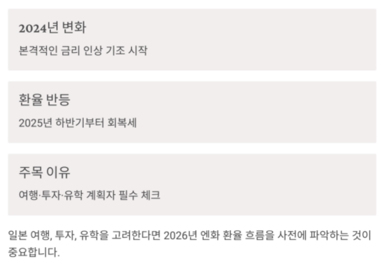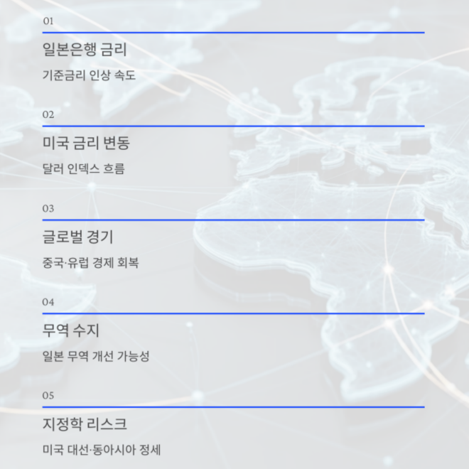 2026년 엔화 환율에 영향을 줄 주요 변수는 다음과 같습니다.
