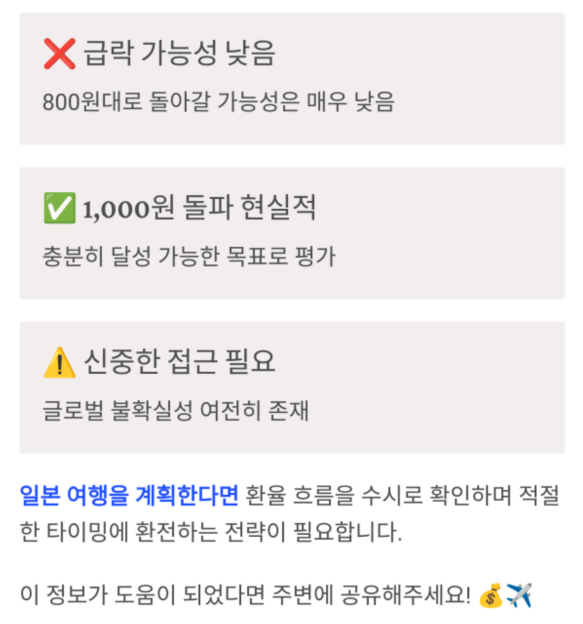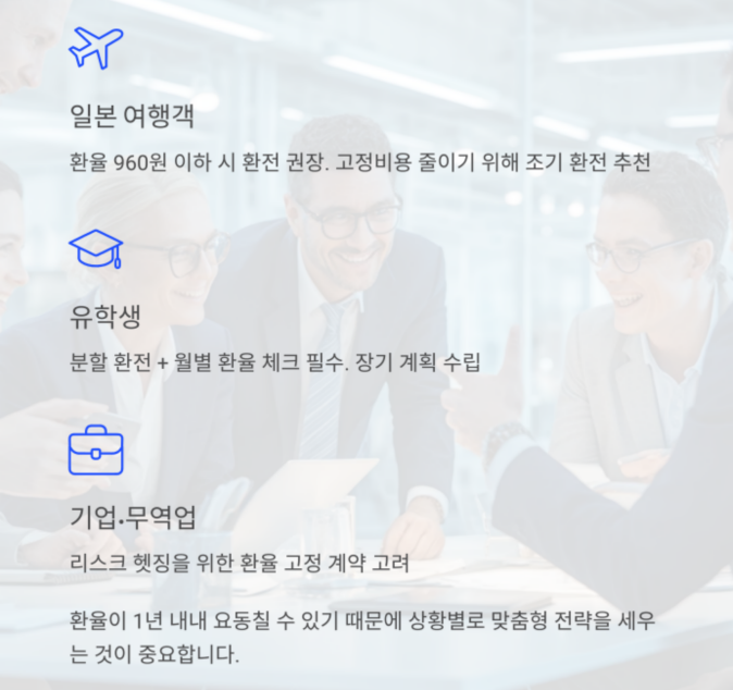 - 일본 여행객: 환율 960원 이하 시 환전 권장, 고정비용 줄이기 위해 조기 환전