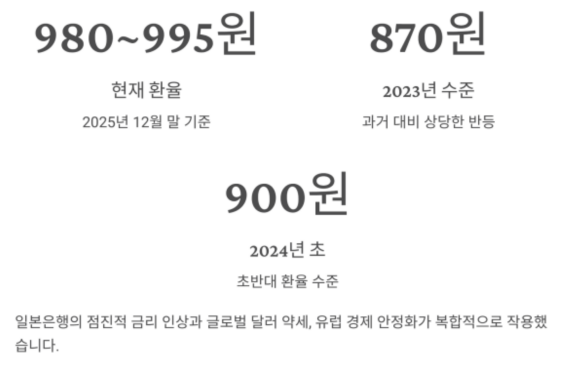 현재 기준(2025년 12월 말) 엔화 환율은 약 980~995원 사이를 오가고 있습니다.