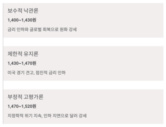 | 보수적 낙관론 | 금리 인하, 글로벌 회복 → 원화 강세 | 1,400~1,430원 |