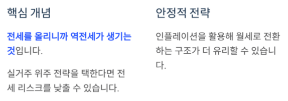 | 전세 안정성 | 꾸준히 우상향 | 인플레·역전세 리스크 혼재 |