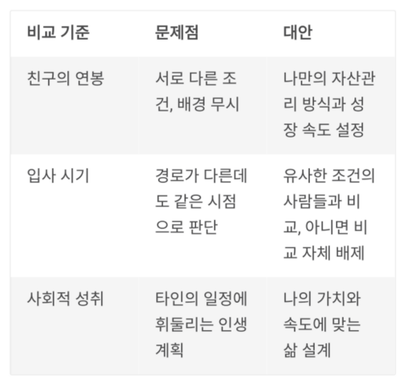 | 친구의 연봉 | 서로 다른 조건, 배경 무시 | 나만의 자산관리 방식과 성장 속도 설정 |