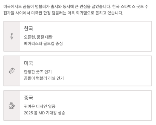 | 한국 | 오픈런, 품절 대란 | 베어리스타 골드컵 중심 |