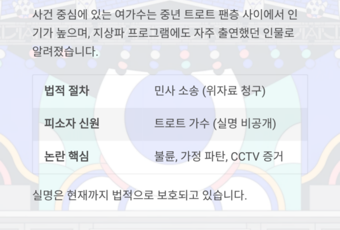 | 피소자 신원 | 트로트 가수 (실명 비공개) |
