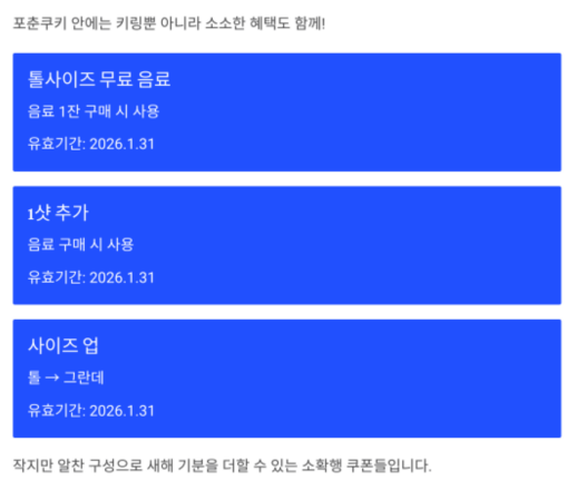 작지만 알찬 구성으로, 새해 기분을 더할 수 있는 소확행 쿠폰들이죠.