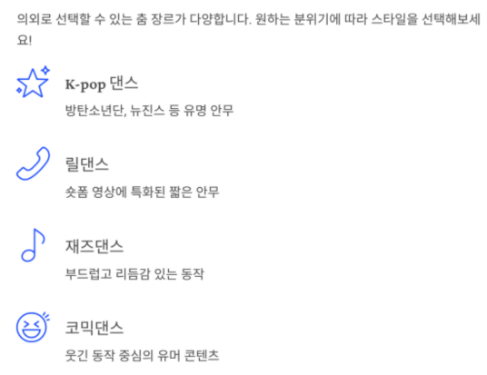 의외로 선택할 수 있는 춤 장르가 다양합니다.