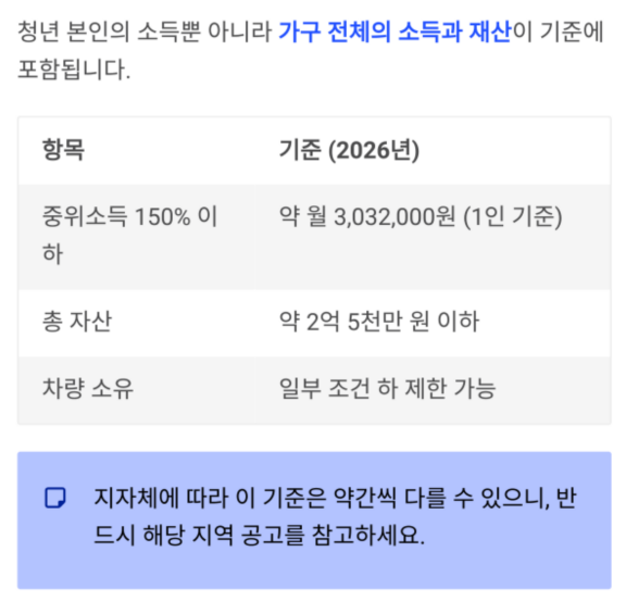청년 본인의 소득뿐 아니라 가구 전체의 소득과 재산이 기준에 포함됩니다.