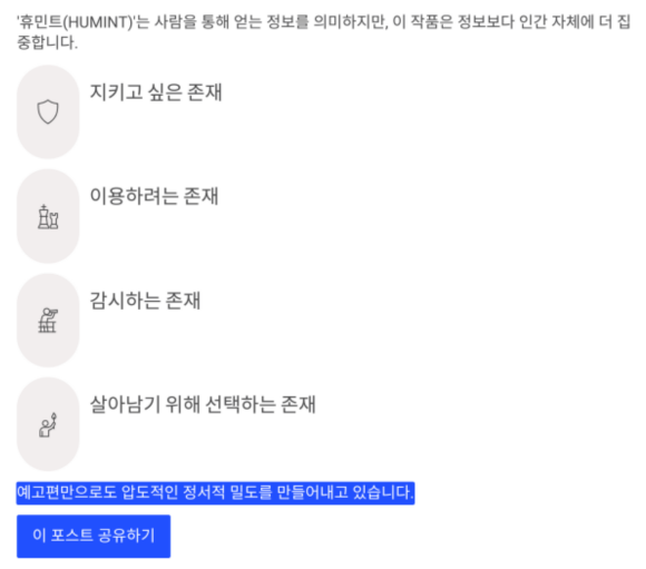 하지만 이번 작품은 정보보다 인간 자체에 더 집중하고 있습니다.