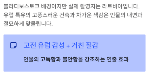| 라트비아 | 고전 유럽 감성 + 거친 질감 | 인물의 고독함과 불안함 강조 |