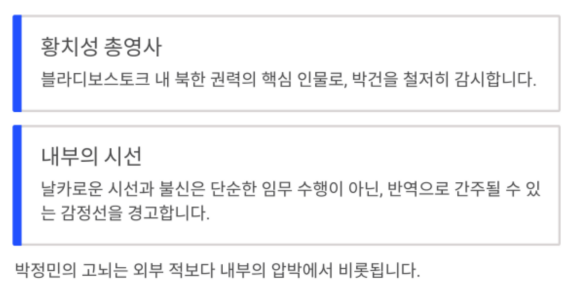 그의 날카로운 시선과 박건을 향한 불신은 단순한 임무 수행이 아닌,
