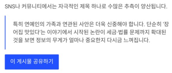 특히 이번처럼 연예인의 가족과 연관된 사안은 더욱 신중해야 합니다.
