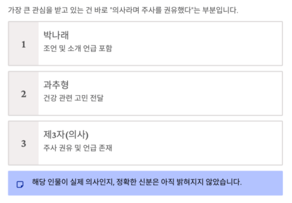 가장 큰 관심을 받고 있는 건 바로 "의사라며 주사를 권유했다"는 부분입니다.