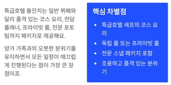| 사진/영상 | 전문 스냅 패키지 포함 가능 | 별도 섭외 필요 |