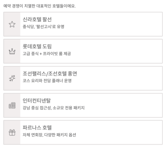 | 인터컨티넨탈 | 웨딩룸 활용 가능 | 강남 중심 접근성, 소규모 전용 패키지 |