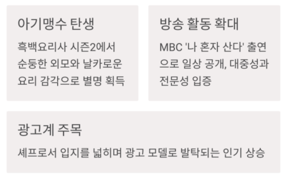 이후 다양한 방송 출연과 함께 인지도를 쌓아가며 셰프로서 입지를 넓히고 있죠.