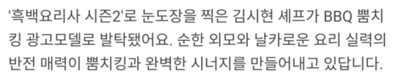 BBQ 치킨 광고모델로 발탁되며 주목받고 있어요.