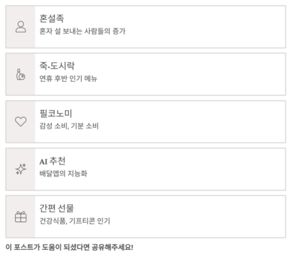 배달 소비 트렌드를 통해 확연히 바뀌고 있다는 걸 알 수 있어요.