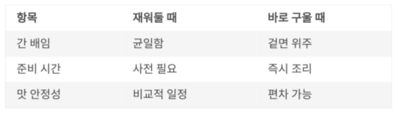 | 준비 시간 | 사전 필요 | 즉시 조리 |