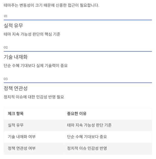 | 실적 유무 | 테마 지속 가능성 판단 기준 |