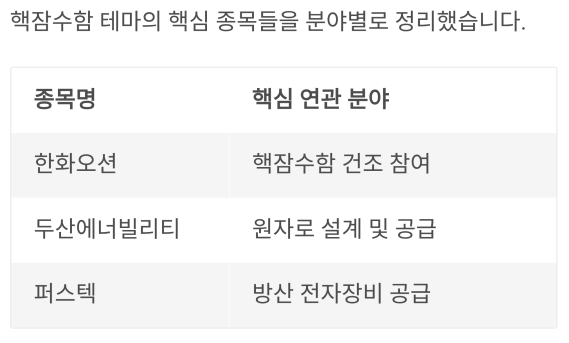 핵잠수함이 방산 및 에너지 산업의 주요 키워드로 떠오르면서 관련 종목들에 대한 관심이 높아지고 있습니다.