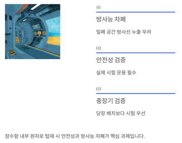 잠수함 내부에 원자로를 탑재할 경우, 안전성과 방사능 차폐 문제가 핵심 과제입니다.