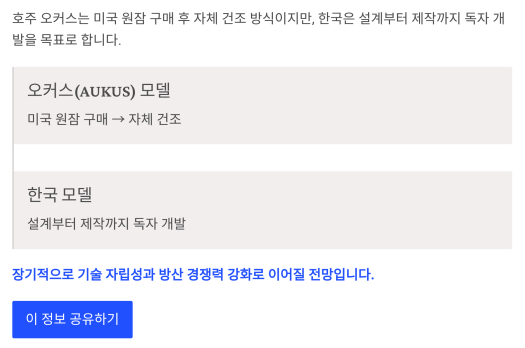 호주의 오커스(AUKUS) 모델은 미국 원잠을 먼저 구매한 후 자체 건조로 이어지는 방식인데 반해,