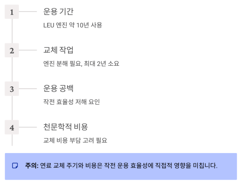 LEU 엔진은 약 10년 간격으로 연료 교체가 필요하며, 이 과정에서 엔진을 분해해야 하기 때문에