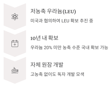 현재 한국은 미국과 협의하여 LEU 확보를 추진 중이며, 이를 통해 자체 원잠 개발을 모색하고 있습니다.
