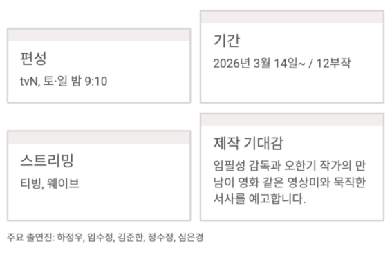 | 방영 기간 | 2026년 3월 14일 ~ (12부작) |