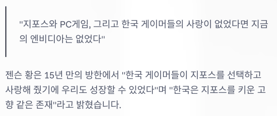 “지포스와 PC게임, 그리고 한국 게이머들의 사랑이 없었다면 지금의 엔비디아는 없었다”라고 단언했습니다.