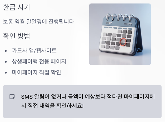 환급은 보통 익월 말일경에 진행되며, 본인이 신청한 카드사나 상생페이백 전용 페이지에서 직접 확인이 가능합니다.