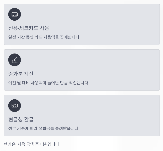 정부에서 지정한 기준에 따라 적립금이 발생하고, 이를 현금성으로 돌려받는 구조죠.