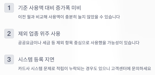 가장 흔한 이유는 ‘기준 사용액 미달’입니다.