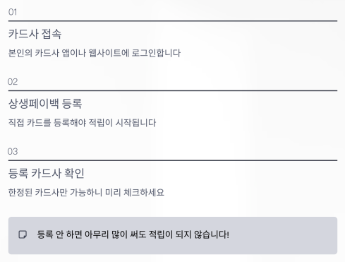 상생페이백은 본인이 직접 카드사를 통해 ‘카드 등록’을 해야 적립이 시작됩니다.