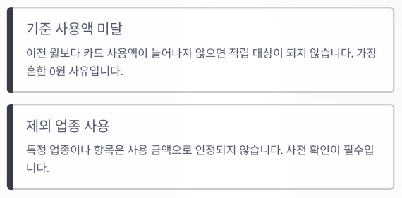 또한 특정 업종이나 항목은 사용 금액으로 인정되지 않기 때문에 사전에 확인이 필요합니다.