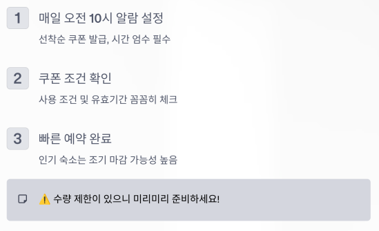 또한, 쿠폰 사용 조건 및 유효기간도 잘 확인한 뒤 예약을 완료하는 것이 중요합니다.