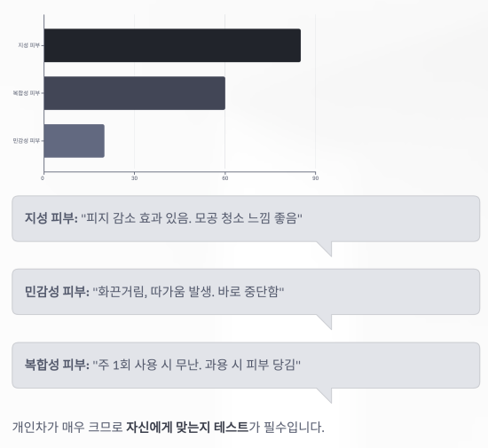 | 복합성 피부 | 주 1회 사용 시 무난. 과용 시 피부 당김 발생 |