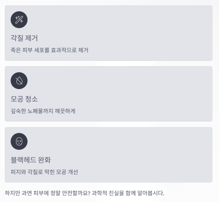 | 긍정 효과 | 피지 제거, 블랙헤드 완화, 모공 청결 |