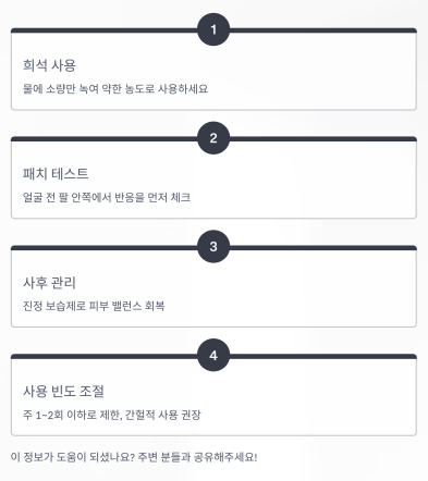 | 패치 테스트 | 얼굴에 사용하기 전 팔 안쪽 등에서 반응 체크 |