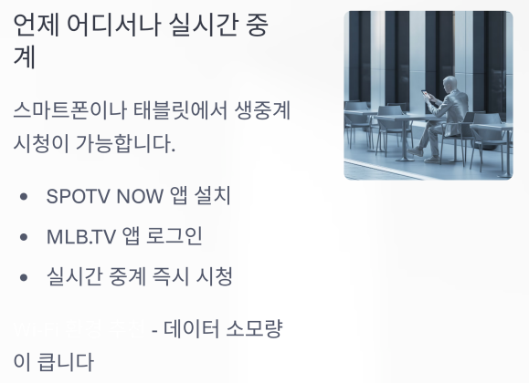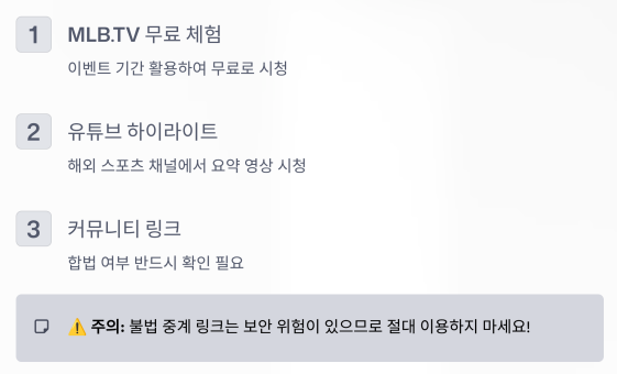 | MLB.TV | 가능 (유료/영어 해설) | 원어민 해설 제공, VPN 필요 |