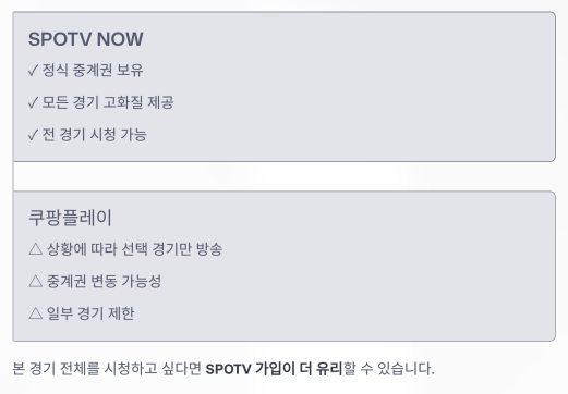 | 쿠팡플레이 | 일부 중계 제공 가능성 | 중계권 상황에 따라 변동 가능 |