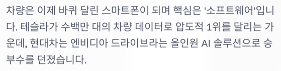 현대차가 엔비디아와 손을 잡은 것은 결국 테슬라와 '같은 무대'에서 싸우기 위한 준비입니다.
